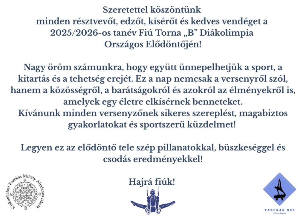 és kezdetét veszi a 2025/2026-os tanév fiú torna „B” Diákolimpia országos elődöntője.